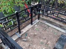 Приехав на участок вновь, мы принялись за установку ограждения, предварительно прополов место захоронения и демонтировав старые памятник с цветником.