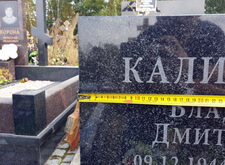 Изначально на месте захоронения находился лишь широкий горизонтальный памятник из чёрного гранита, разделённый на две половины светлым православным крестом. Клиент пожелал выгравировать на пустом пространстве памятник новую надпись, так как на могиле недавно произошло дозахоронение.
